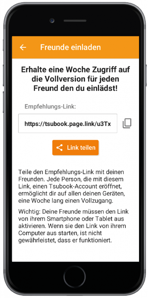 - Teile den angezeigten Empfehlungslink über deine Kanäle. Nutze den orangefarbenen Knopf oder kopiere den Link, um ihn zu teilen. Für jede Person, die sich über diesen Link von ihrem Smartphone oder Tablet aus registriert, bekommst du automatisch eine Woche freien Zugang zu allen Inhalten von Tsubook!